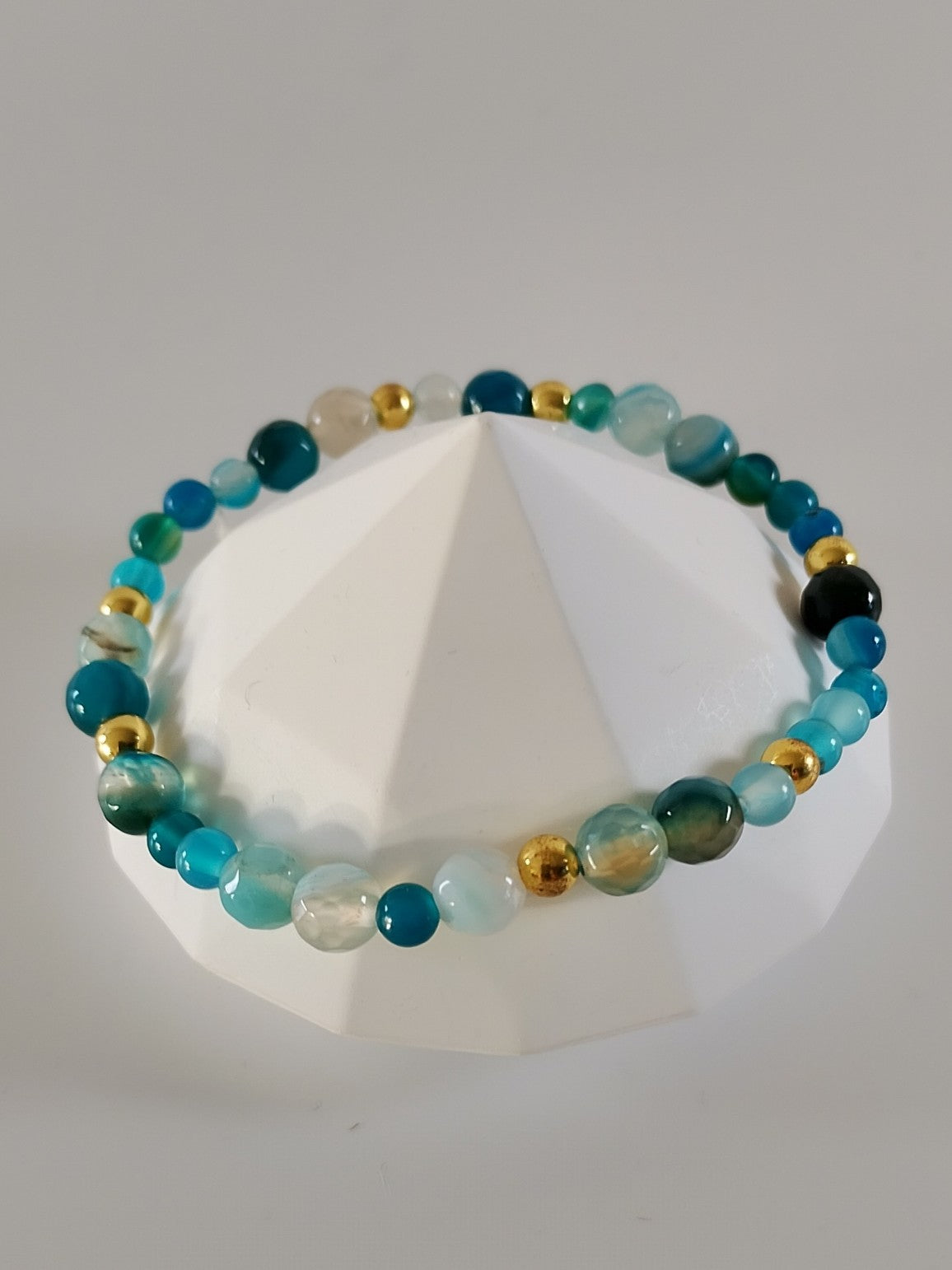 Her er et armbånd med unikke jade og agat perler i forskellige blå - grønne nuancer samt forgyldte hæmatit perler, der tilfører et eksklusivt og varmt udtryk.
