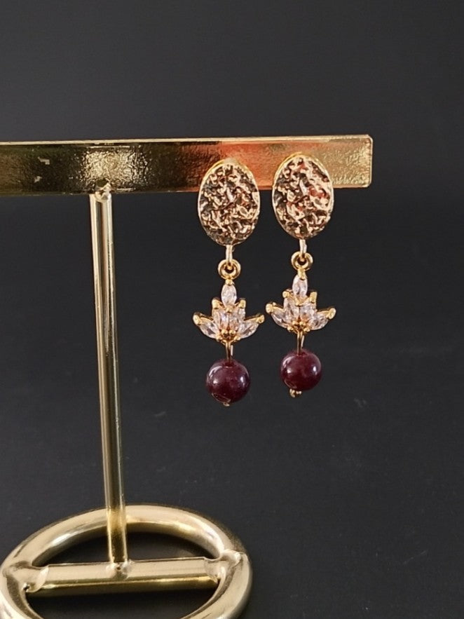 Elegant oval ørestik med hammered look i 18 karats vandfast forgyldte stål med et lotus vedhæng fyldt med zirkonia sten og en flot blank og dyb rød granat perle.