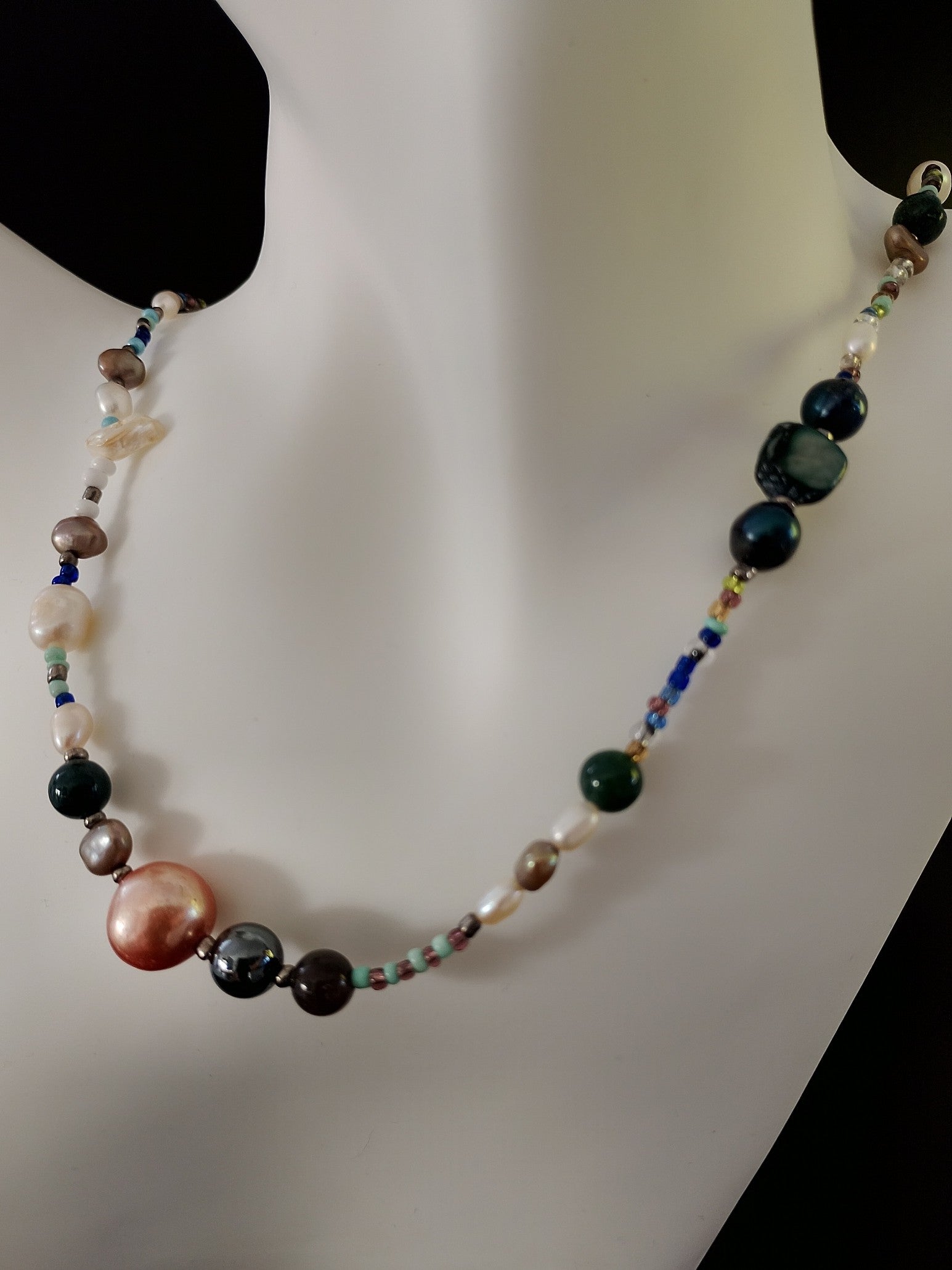 En smuk perlehalskæde skabt som et levende samspil af forskellige halvædelsten, flerfarvede ferskvandsperler og små funklende glasperler i et væld af nuancer.