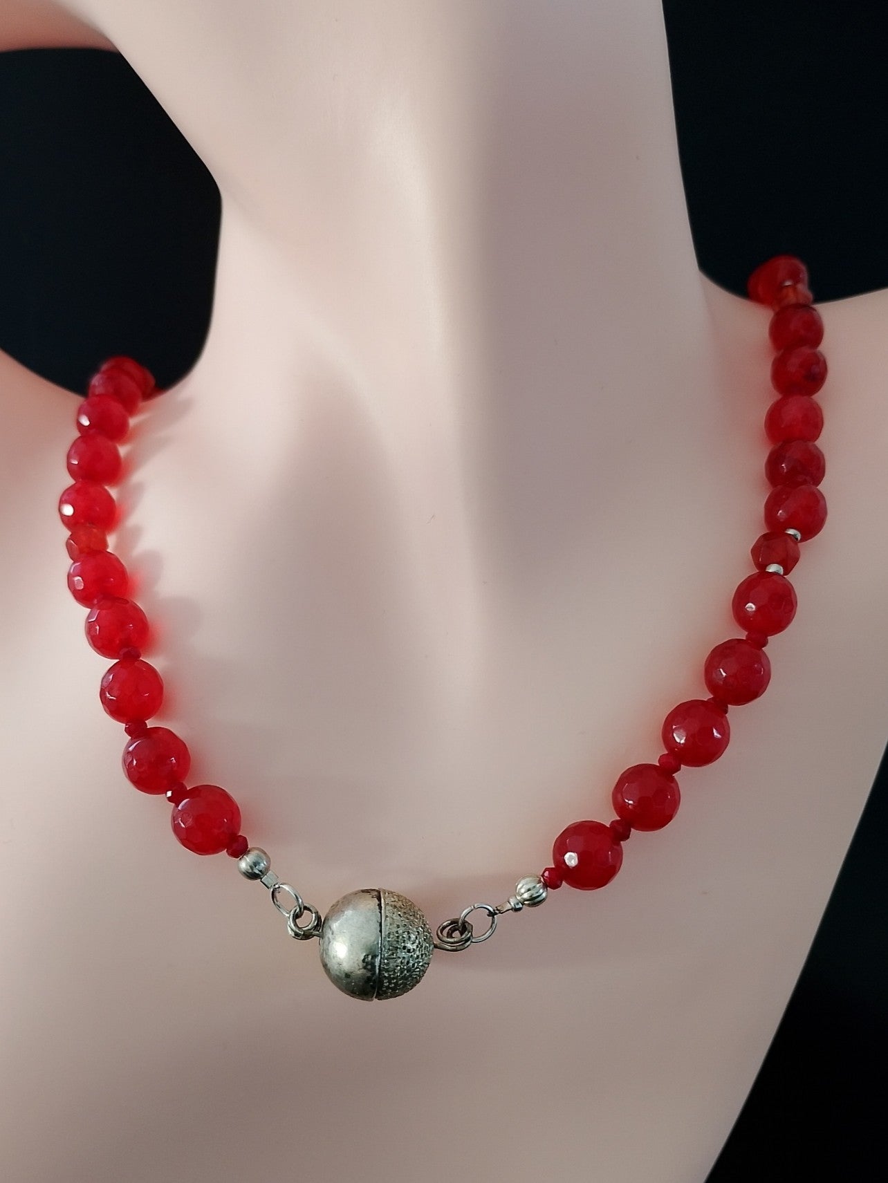 En forførende perlehalskæde, med røde jade perler samt små røde glas perler.