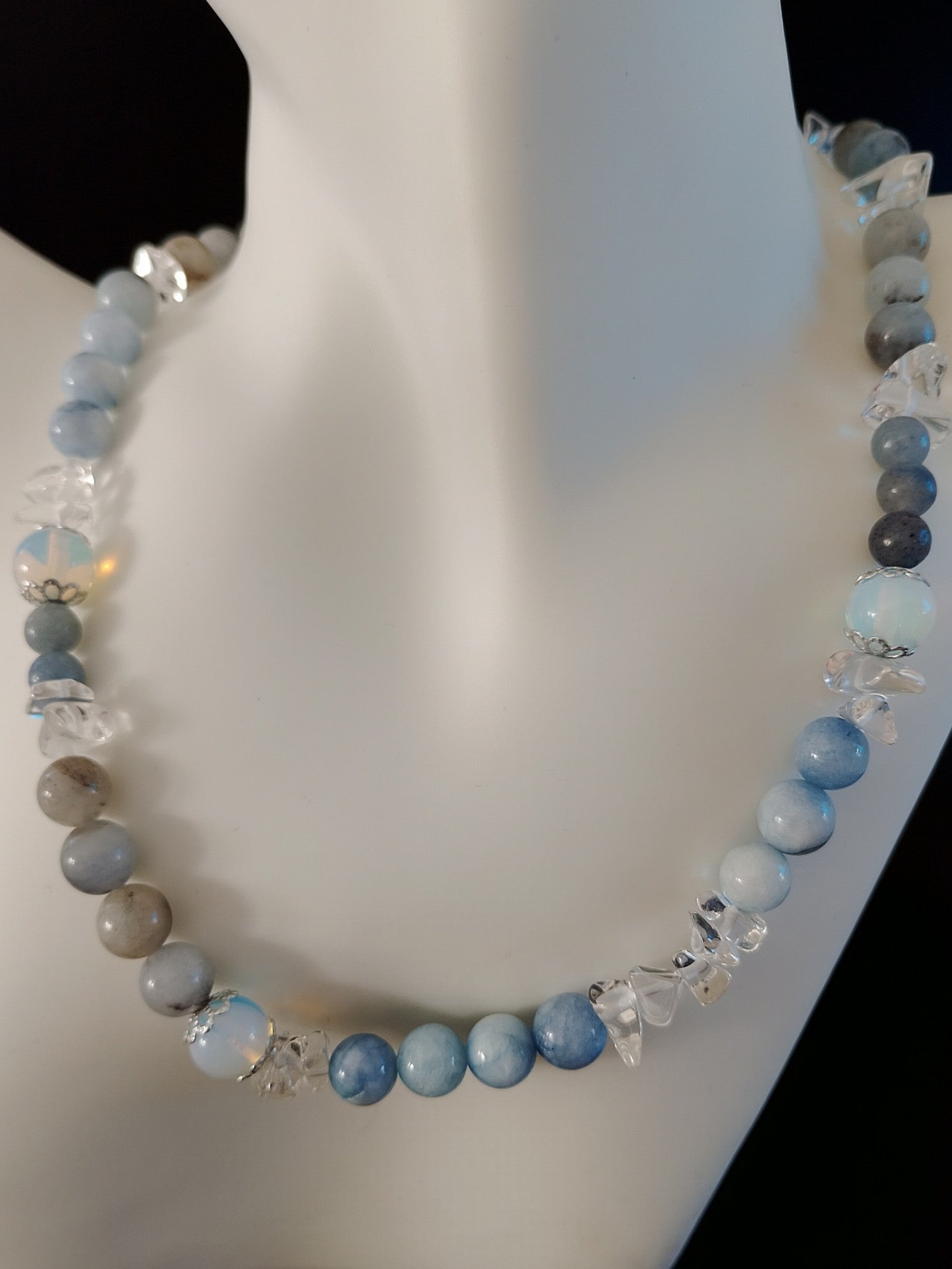 En drømmende perlehalskæde, hvor opal, klar kvarts og lyseblå agat perler smelter sammen i et harmonisk udtryk.