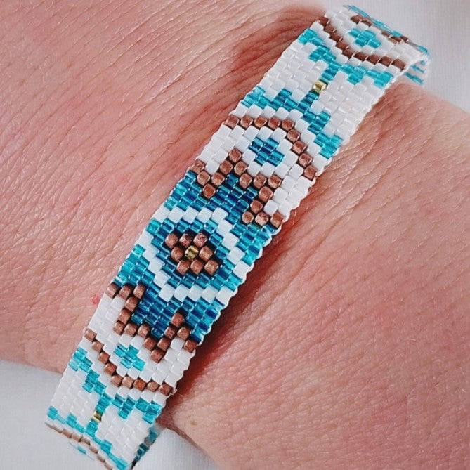 Dette unikke armbånd er lavet med den klassiske peyote stitch teknik og forener eksklusivt håndværk med et moderne, romantisk udtryk.