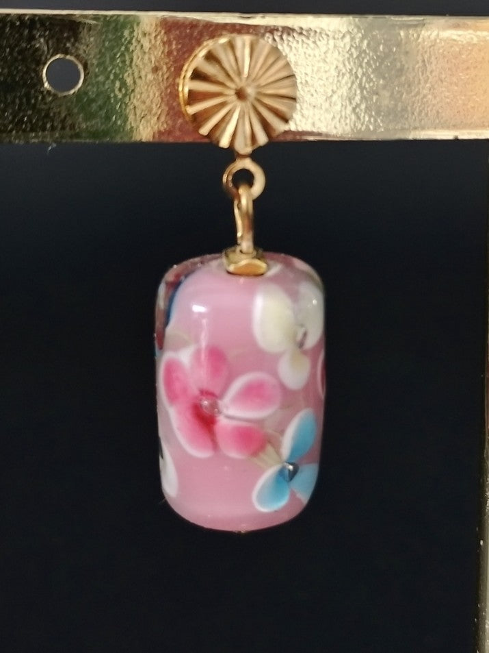 18 karats vandfast forgyldt stål ørestik med smukt blomster mønster og en rosa farvet glas perle med farverige blomsterdetaljer.