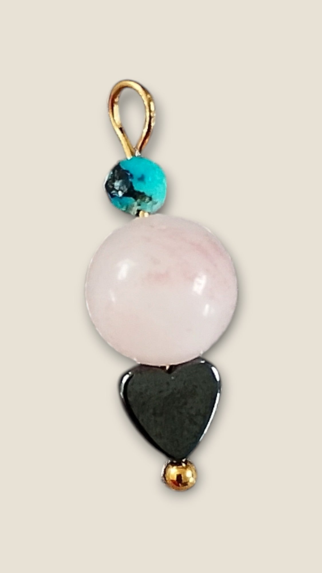 Personaliser din halskæde med dette elegante vedhæng, der kombinerer tre udvalgte halvædelsten, et blodstens hjerte for styrke, rosenkvarts for kærlighed og turkis for harmoni. Perfekt til at skabe dit eget unikke smykke.