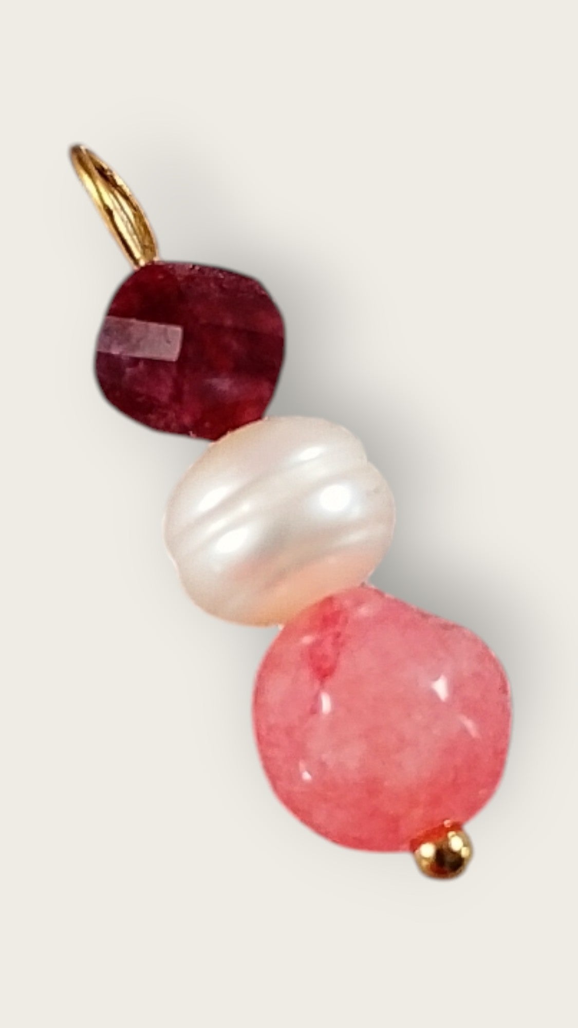Skab dit eget unikke design med dette elegante vedhæng, der kombinerer en dyb rød granatperle, en blød ferskvandsperle og koral farvede jade.